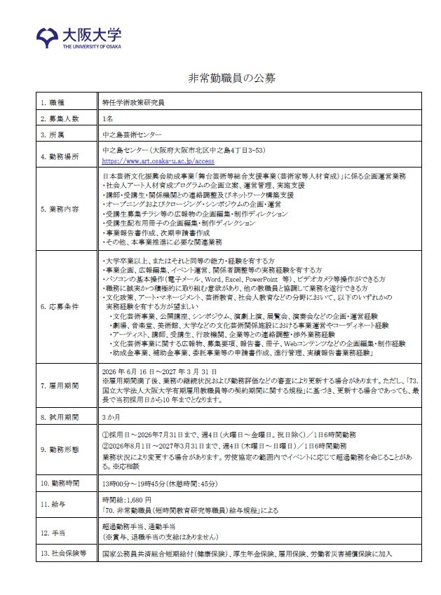 お知らせ大阪大学中之島芸術センター特任学術政策研究員公募(5/15〆) 2026年4月28日0 分 (目安の読了時間) 大阪大学中之島芸術センターでは、日本芸術文化振興会助成事業「舞台芸術等総合支援事業(芸術家等人材育成)」に係る企画運営業務を行う特任学術政策研究員を募集します。