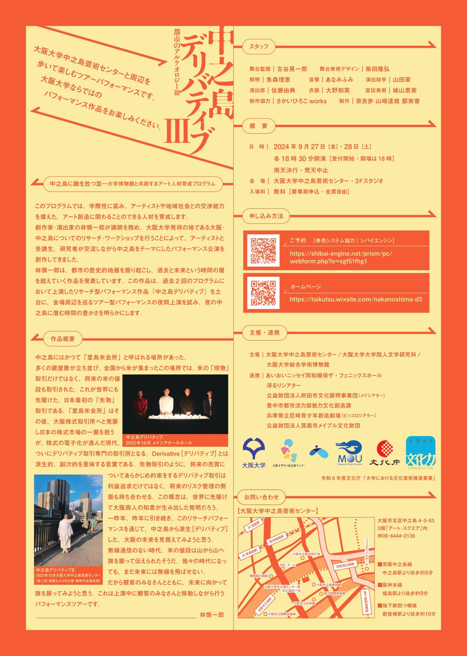 中之島にはかつて「堂島米会所」と呼ばれる場所があった。多くの蔵屋敷が立ち並び、全国から米が集まったこの場所では、米の「現物」取引だけはなく、将来の米の値段も取引された。これが世界にも先駆けた、日本最初の「先物」取引である。「堂島米会所」はその後、大阪株式取引所へと発展し日本の株式市場の一翼を担うが、株式の電子化が進んだ現代、ついにデリバティブ取引専門の取引所となる。Derivative(デリバティブ)とは派生的、副次的を意味する言葉である。先物取引のように、将来の売買についてあらかじめ約束をするデリバティブ取引は利益追求だけではなく、将来のリスク管理の側面も持ち合わせる。この概念は、世界に先駆けて大阪商人の知恵が生み出した発明だろう。一昨年、昨年に引き続き、このリサーチパフォーマンスを通じて、中之島から派生(デリバティブ)した、大阪の未来を見据えてみようと思う。無線通信のない時代、米の値段は山から山へ旗を振って伝えられたそうだ。我々の時代になっても、まだ未来には無線を飛ばせない。だから観客のみなさんとともに、未来に向かって旗を振ってみようと思う。これは上演中に観客のみなさんと移動しながら行うパフォーマンスツアーです。 (林 慎一郎)